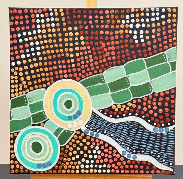 This piece captures the force and rejuvenation of flood waters. Yes they can be very distructive too but the Willandra Creek system is such a lifeforce for our land and animals that the flood waters are welcomed, more often than not. The water flows in whatever direction it can, meandering across the plains refreshing the ground and inviting birds and animals to drink. Black swans, pelicans and even seagulls flock to watery lands and we even had fish swimming up the bitumen roads.